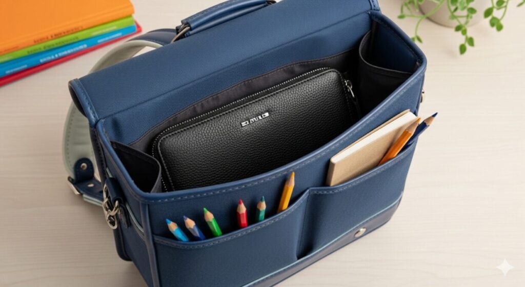 ご質問の「長財布も入るか?」という点については、全く問題ありません。メインの収納スペースはもちろん、多くのランドセルに備わっている前ポケット(ファスナー付きの収納部)にも、一般的なサイズの長財布であれば余裕をもって収納することが可能です。